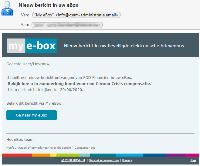 Depuis le 15 juin, des e-mails de phishing imitant une notification eBox circulent. Ces e-mails indiquent que les utilisateurs peuvent bénéficier d’une indemnisation corona auprès du SPF Finances et redirigent vers un site web qui est une copie de myebox.be. D’où l’on vous demandera de vous connecter et de […]